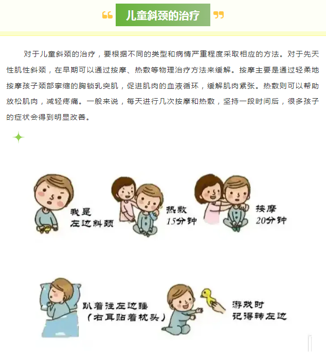 兒童斜頸,簡(jiǎn)單來(lái)說(shuō),就是孩子的頭部向一側(cè)傾斜,而下巴則轉(zhuǎn)向另一側(cè)的一種異常姿勢(shì)。這種情況在嬰幼兒時(shí)期較為常見(jiàn)。引發(fā)兒童斜頸的原因有多種,其中先天性肌性斜頸是較為常見(jiàn)的類型。它主要是由于一側(cè)胸鎖乳突肌攣縮導(dǎo)致的。在孩子出生后不久,家長(zhǎng)可能就會(huì)發(fā)現(xiàn)孩子的頭部總是偏向一側(cè),頸部還可能摸到一個(gè)硬結(jié)。這其實(shí)就是胸鎖乳突肌發(fā)生病變的表現(xiàn)。除了先天性肌性斜頸,還有骨性斜頸,這是由于頸椎骨骼發(fā)育異常引起的,不過(guò)這種情況相對(duì)較少。另外,姿勢(shì)性斜頸也不容忽視,它通常是因?yàn)楹⒆娱L(zhǎng)期保持不良的睡眠姿勢(shì)或者抱姿導(dǎo)致的。如果不及時(shí)糾正,也可能會(huì)逐漸加重,影響孩子的正常發(fā)育。